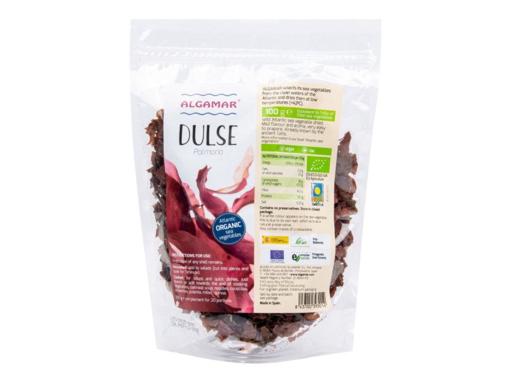 Mořské řasy Dulse v biokvalitě. Mají jemnou chuť a aroma, jsou přirozeně bezlepkové a vhodné pro vegany. Jejich příprava je snadná. Řasy můžete použít jako koření, přidávají se do polévek, do salátů i do hlavních jídel.Doplňkové parametry
