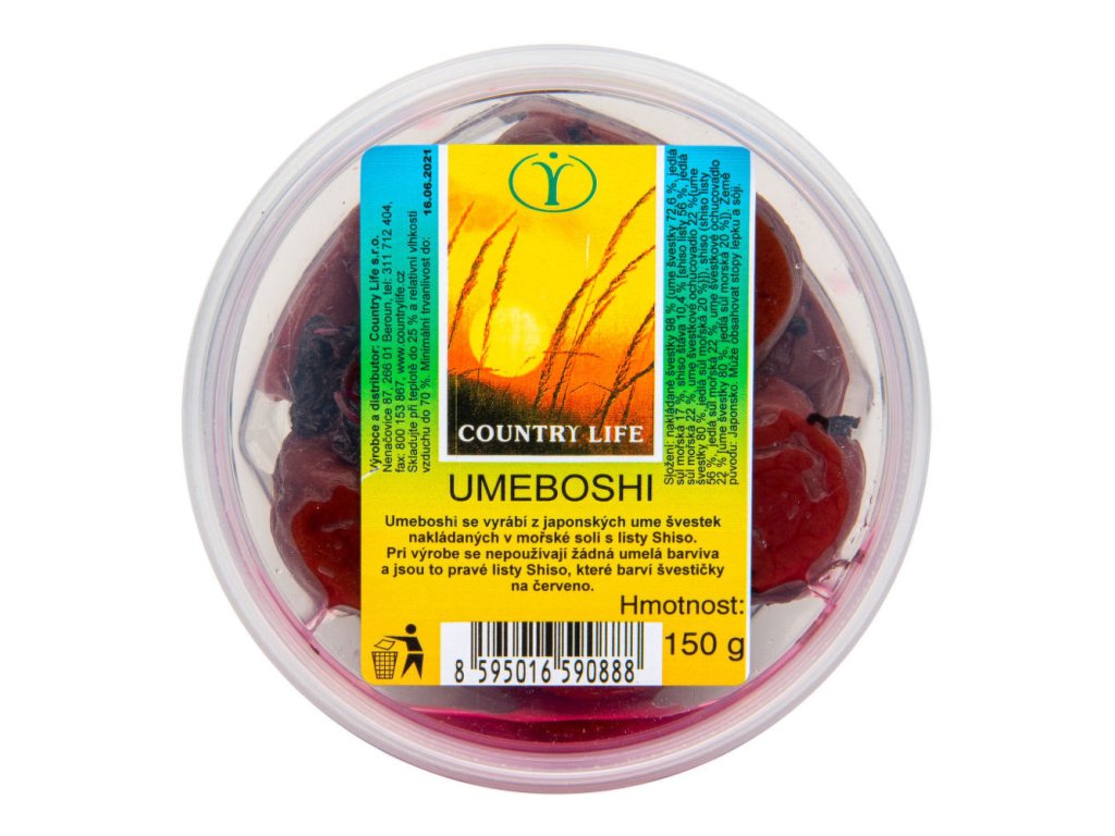 Umeboshi patří k tradičním japonským produktům. Vyrábí se z japonských ume švestek nakládaných v mořské soli s listy Shiso. Jsou velmi slané a vhodné jako příležitostná pochoutka.Doplňkové parametry